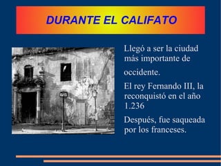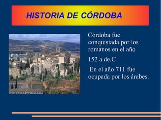 Córdoba fue conquistada por los romanos en el siglo II a.C. y ocupada por los árabes en el año 711 d.C. Llegó a ser la ciudad más importante de occidente bajo el Califato, hasta que fue reconquistada por Fernando III en 1236. Algunos de sus monumentos más destacados son la Mezquita, los patios cordobeses y el puente romano sobre el río Guadalquivir.