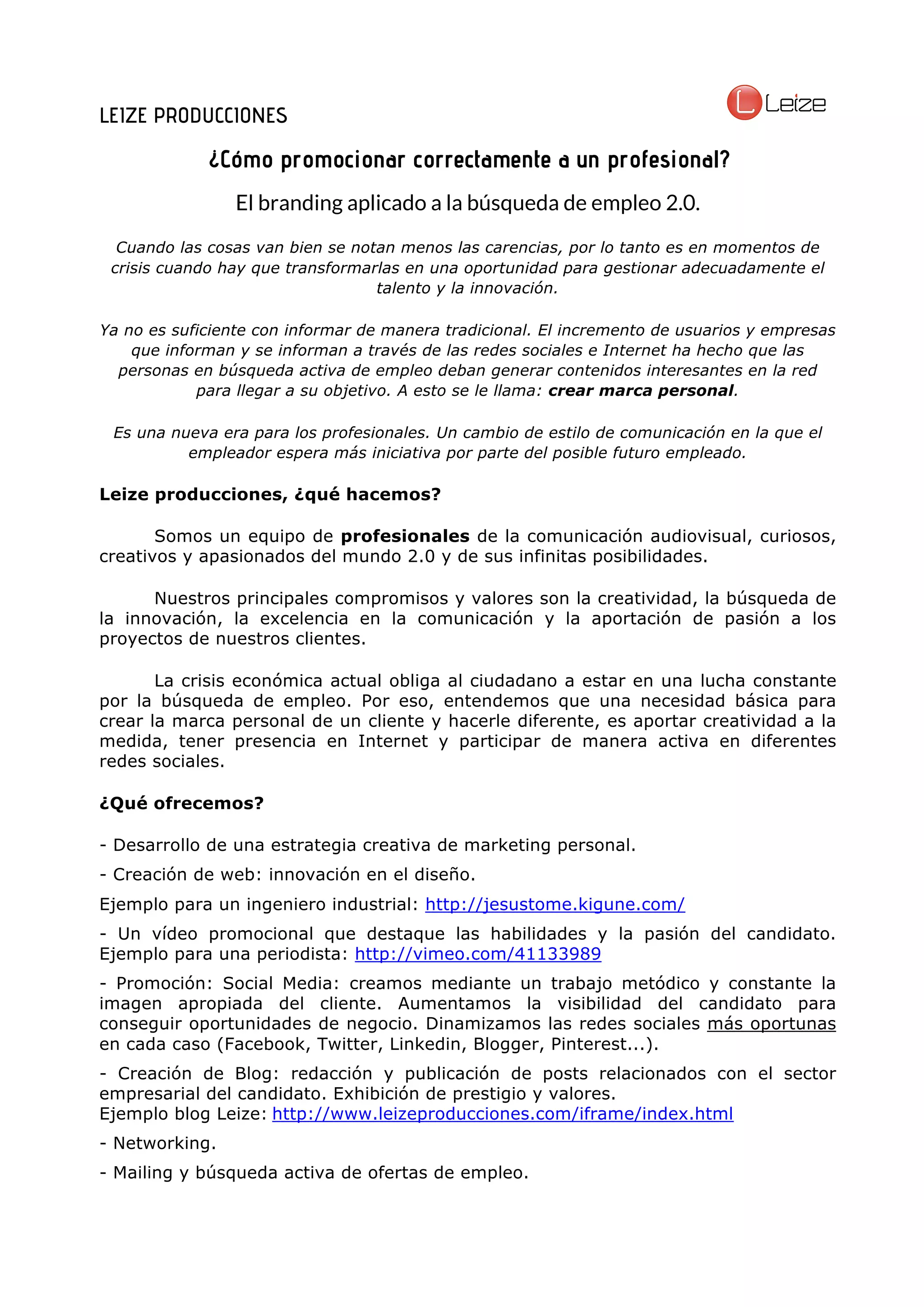 El documento habla sobre la importancia de crear una marca personal para profesionales que buscan empleo en la era digital. Explica que las redes sociales e Internet son ahora cruciales para que los candidatos generen contenido interesante y muestren iniciativa para llegar a sus objetivos laborales. También describe los servicios que ofrece Leize Producciones para ayudar a los profesionales a crear su marca personal a través de estrategias de marketing, páginas web, videos promocionales y presencia en redes sociales.