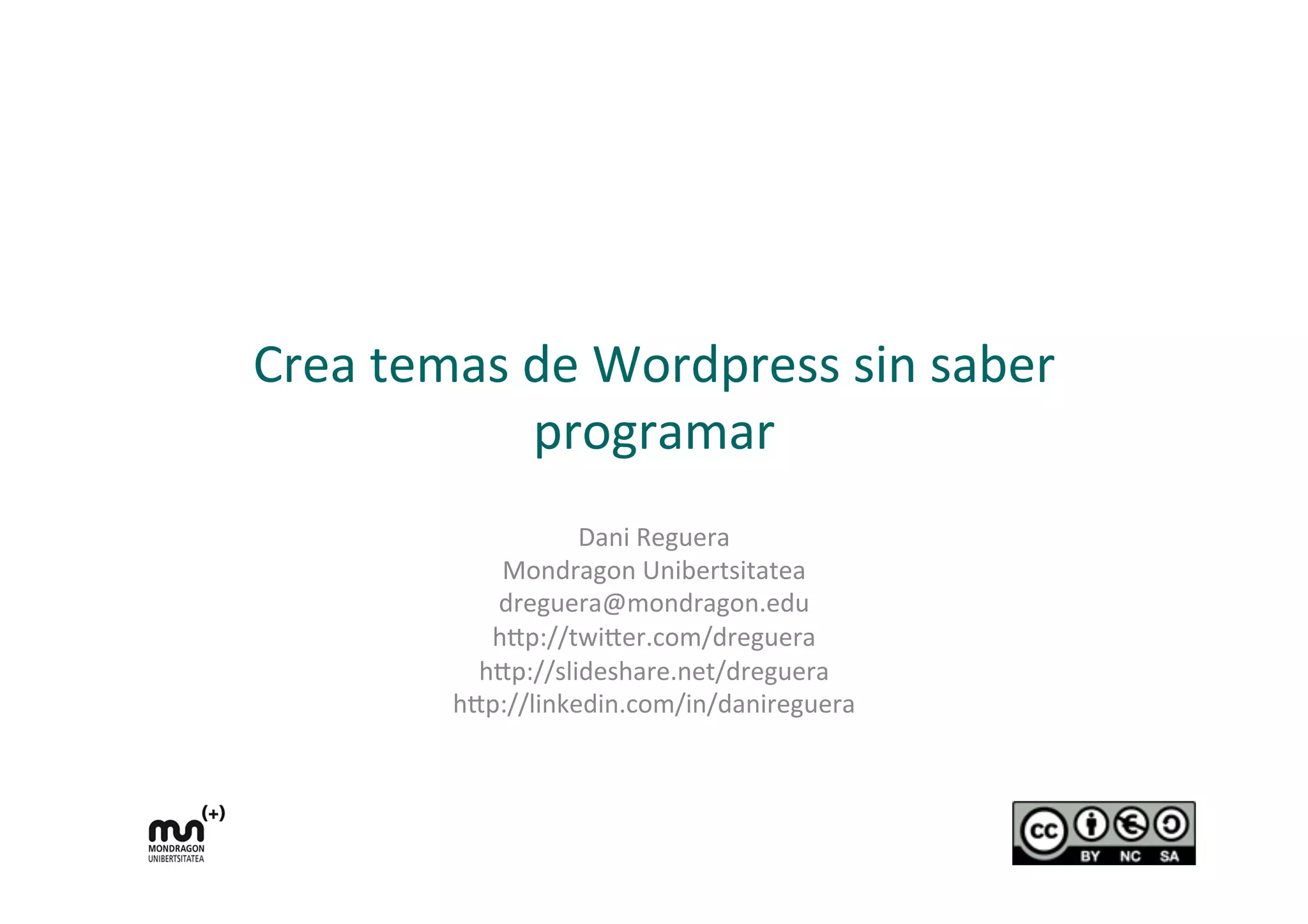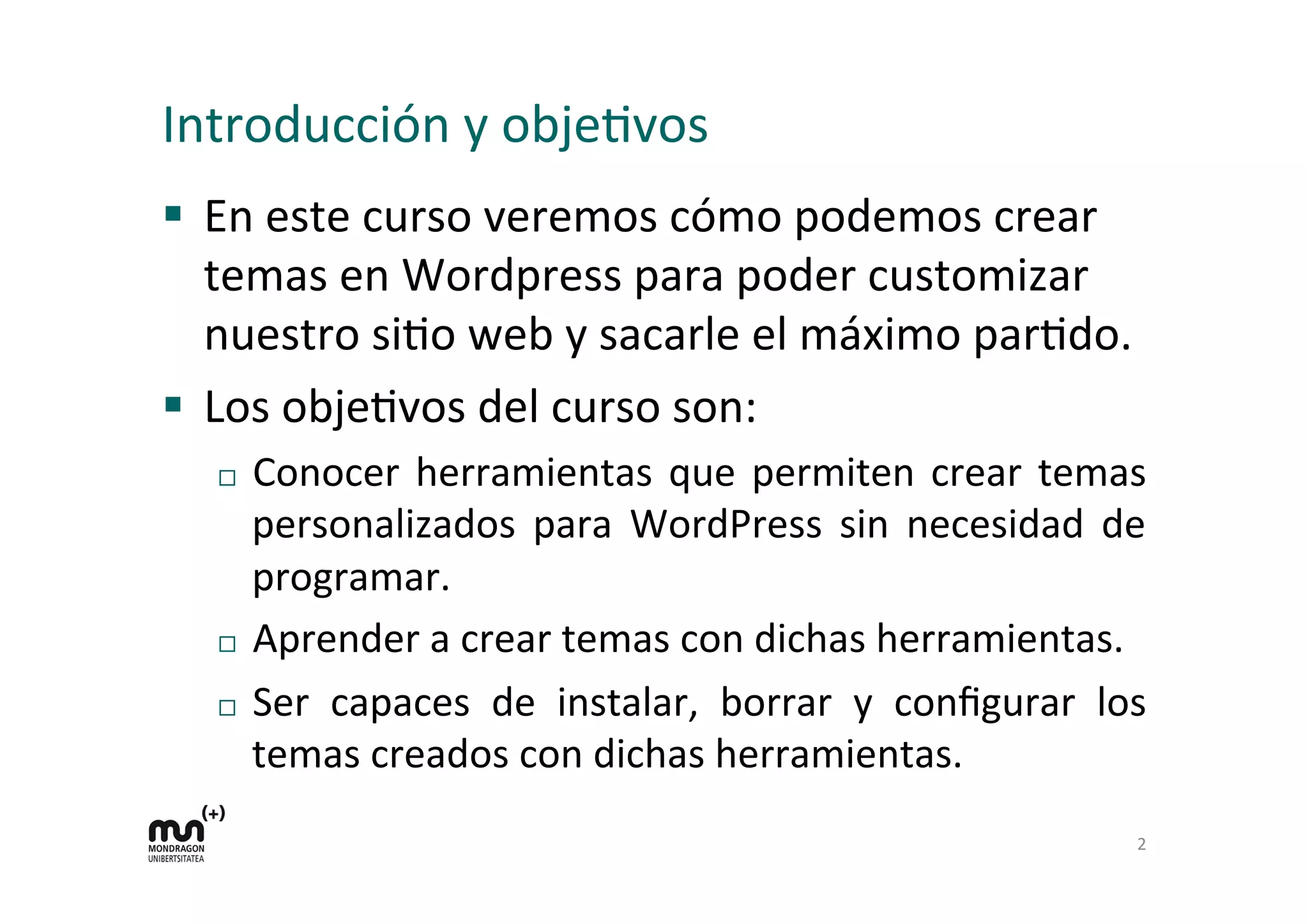 El documento detalla un curso sobre cómo crear temas personalizados en WordPress sin necesidad de programación, destacando herramientas y procesos para modificar la apariencia del sitio web. Se explica la estructura de un tema de WordPress, así como las opciones para instalar, eliminar y crear nuevos temas, incluyendo el uso de herramientas de terceros. Además, se resalta la importancia de conocer la funcionalidad y las opciones disponibles en la comunidad de WordPress para maximizar su uso.
