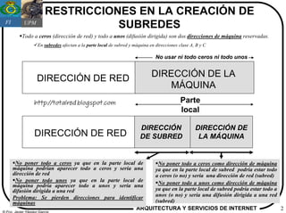 El documento explica cómo crear subredes de acuerdo a los RFC 950 y 1219. Señala que al crear subredes deben reservarse las direcciones "todo ceros" y "todo unos" en la parte local de máquina, pero no necesariamente en la parte local de subred. Muestra un ejemplo de cómo dividir una red en dos subredes usando dos bits en la máscara de subred.