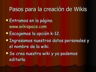 Este documento proporciona instrucciones sobre cómo crear una wiki en wikispace.com. Explica los pasos iniciales de registro e ingreso de datos personales, y cómo luego editar y agregar contenido como texto e imágenes a la wiki recién creada. También describe las diferentes funciones y opciones disponibles en una wiki como ver y administrar páginas, miembros, permisos, notificaciones y más.