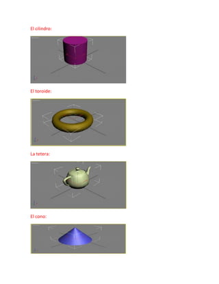 Este documento describe cómo crear diferentes objetos básicos en 3Ds max6, incluyendo esferas, cajas, cilindros, toroides, teteras, conos, geoesferas, tubos, pirámides y planos.