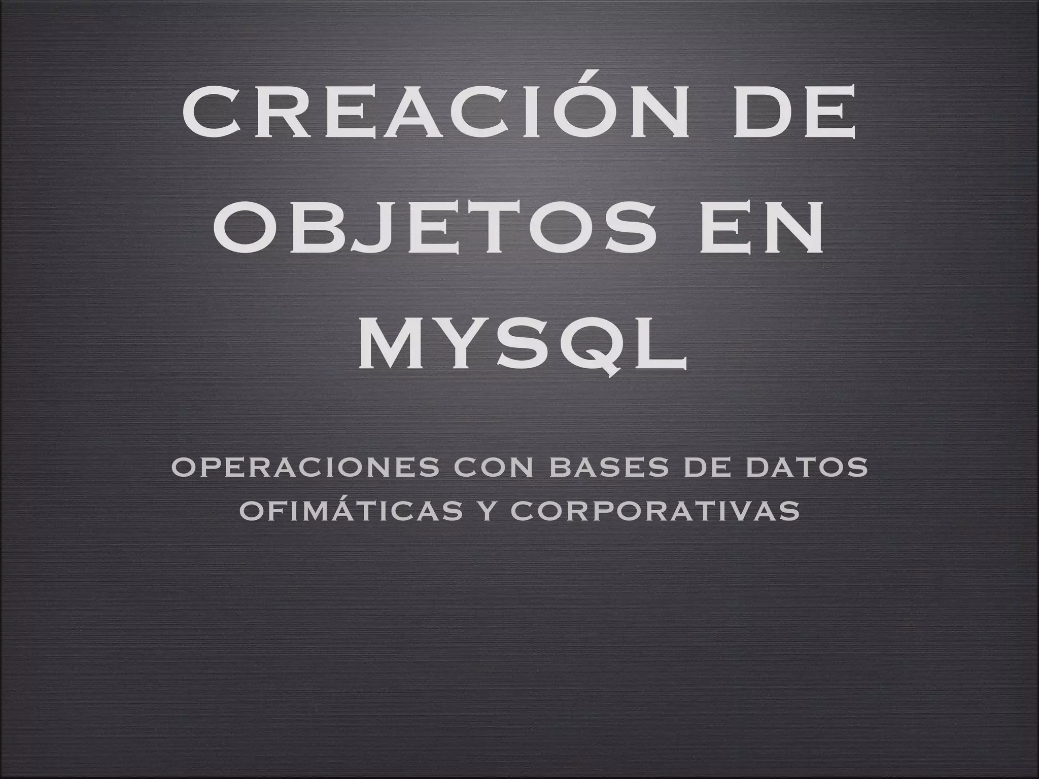 1) El documento describe las operaciones básicas para crear y manipular bases de datos en MySQL, incluyendo la creación de tablas, tipos de datos, restricciones, claves primarias, claves ajenas y vistas.