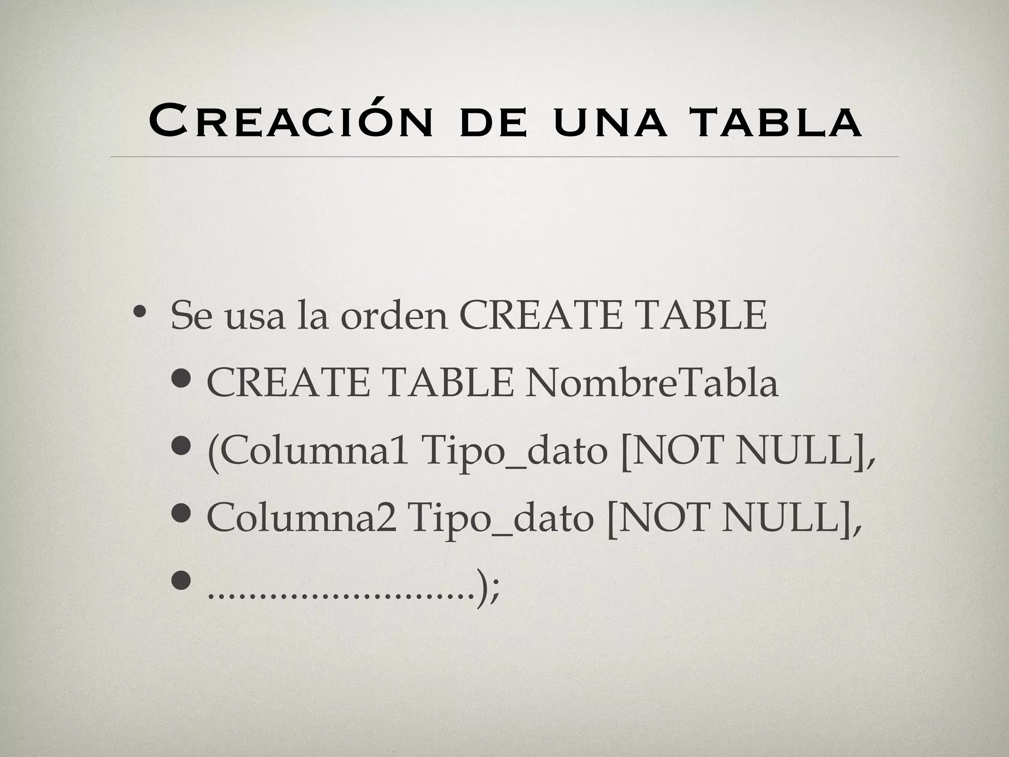 2) Se explican comandos como CREATE TABLE, INSERT, ALTER TABLE, DROP TABLE, CREATE VIEW y cómo añadir y modificar columnas, restricciones y otros atributos de las tablas.