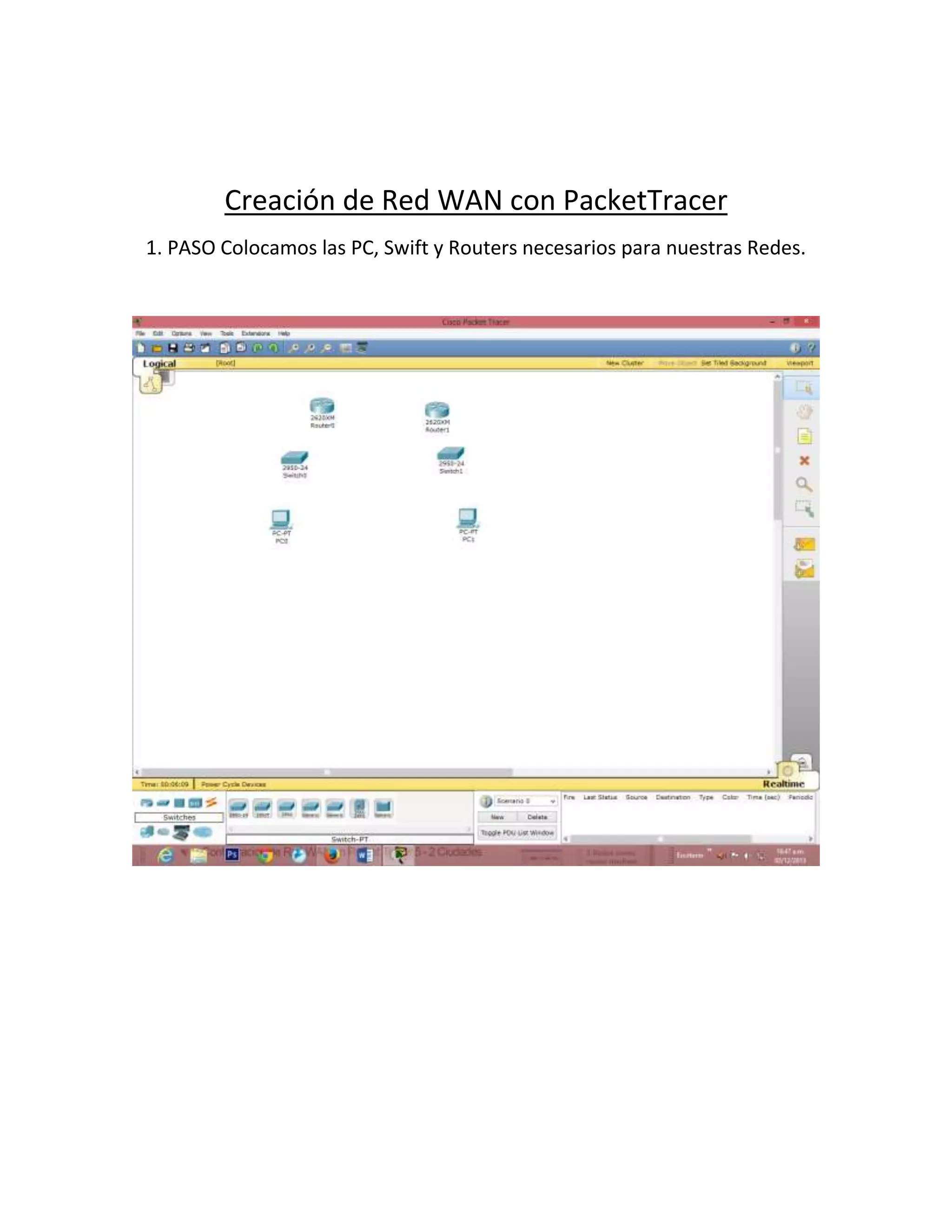 Se creó una red WAN en PacketTracer colocando computadoras, un switch y routers. Se configuraron las IPs de cada dispositivo y se conectaron los routers a través de un cable serial luego de agregar una nueva interfaz, ya que inicialmente no tenían el puerto necesario.