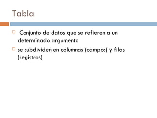 El documento describe cómo crear tablas en Microsoft Excel. Explica que una tabla organiza datos en columnas y filas. Ofrece tres opciones para crear tablas: vista de hoja de datos, vista diseño y asistente para tablas. También detalla los diferentes tipos de campos que se pueden incluir en una tabla, como texto, numérico, fecha/hora y sí/no.