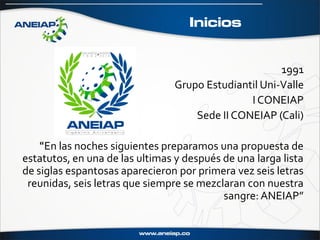 La Asociación Nacional de Estudiantes de las Instituciones de Educación Superior de Colombia (ANEIAP) se creó en 1991 como una organización estudiantil con cobertura nacional. Actualmente cuenta con presencia en universidades de las regiones Costera, Cafetera, Paisa y Succidente. Ofrece programas como la Escuela de Alta Dirección, plataformas comunicativas, revista digital, boletines y convenios empresariales. Celebra su aniversario cada 4 de octubre.