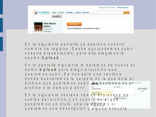 El documento describe los pasos para crear un blog personal en Blogger y administrarlo. Incluye instrucciones para crear una cuenta de Gmail, configurar un blog en Blogger eligiendo un nombre, plantilla y contenido inicial, y gestionar entradas, comentarios y estadísticas del blog desde el panel de Blogger. También explica cómo insertar vídeos de YouTube y presentaciones de SlideShare en el blog.