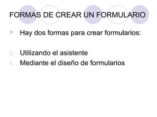 Este documento describe dos métodos para crear formularios en Microsoft Access: utilizando el asistente o diseñando el formulario manualmente. El asistente guía al usuario a través de los pasos de crear una tabla, seleccionar el diseño y los campos del formulario. Para diseñar un formulario manualmente, el usuario selecciona la opción de formulario, elige la tabla de origen, arrastra los campos al diseño y puede personalizar elementos como encabezados, pies de página e imagen de fondo.