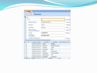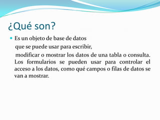 Los formularios son objetos de base de datos que se pueden usar para mostrar, editar o modificar datos de una tabla o consulta. Permiten controlar el acceso a los datos al seleccionar qué campos o registros se muestran. Se pueden crear formularios de varias maneras, incluyendo usar herramientas como Formulario, Formulario dividido, Varios elementos o crear uno en blanco.
