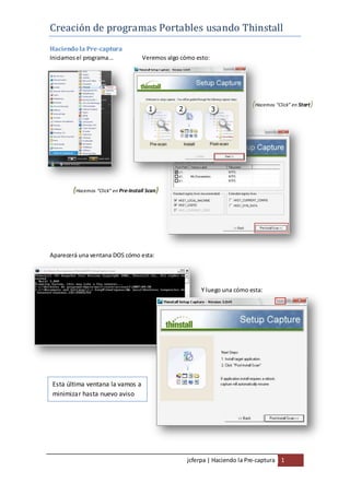 Este documento describe el proceso de crear programas portables usando Thinstall. Inicia con una pre-captura del sistema para identificar archivos y configuraciones. Luego se instala el programa objetivo y se hace una post-captura. Se ajusta la captura eliminando archivos y carpetas innecesarias. Finalmente se crea el portable ejecutando Build.bat.