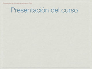 Este documento presenta un curso sobre la construcción de sitios web a medida utilizando sistemas de gestión de contenidos (CMS). Explica qué es un CMS, sus ventajas frente a sitios web tradicionales, y provee una visión general de WordPress, Joomla y Drupal. También cubre el funcionamiento básico de un CMS, los requisitos para instalar uno y el proceso de instalación.