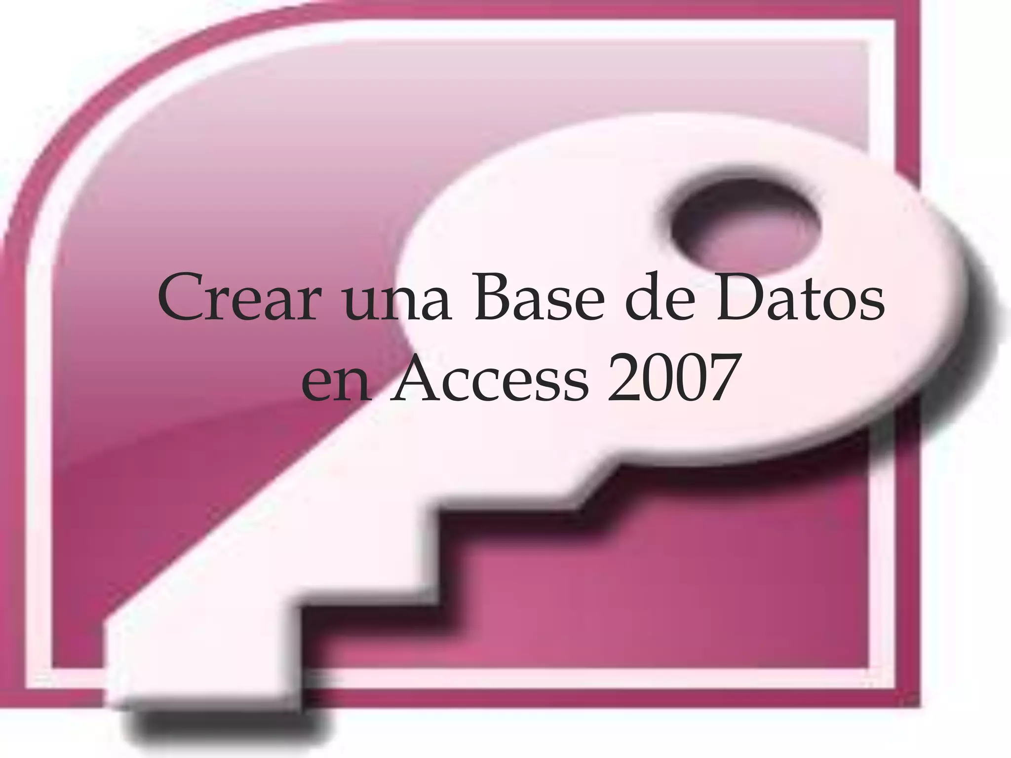 El documento explica los pasos para crear una base de datos en Access 2007, incluyendo seleccionar una ubicación y nombre para el archivo, crear tablas, modificar la estructura de las tablas, crear relaciones entre tablas, y crear consultas.