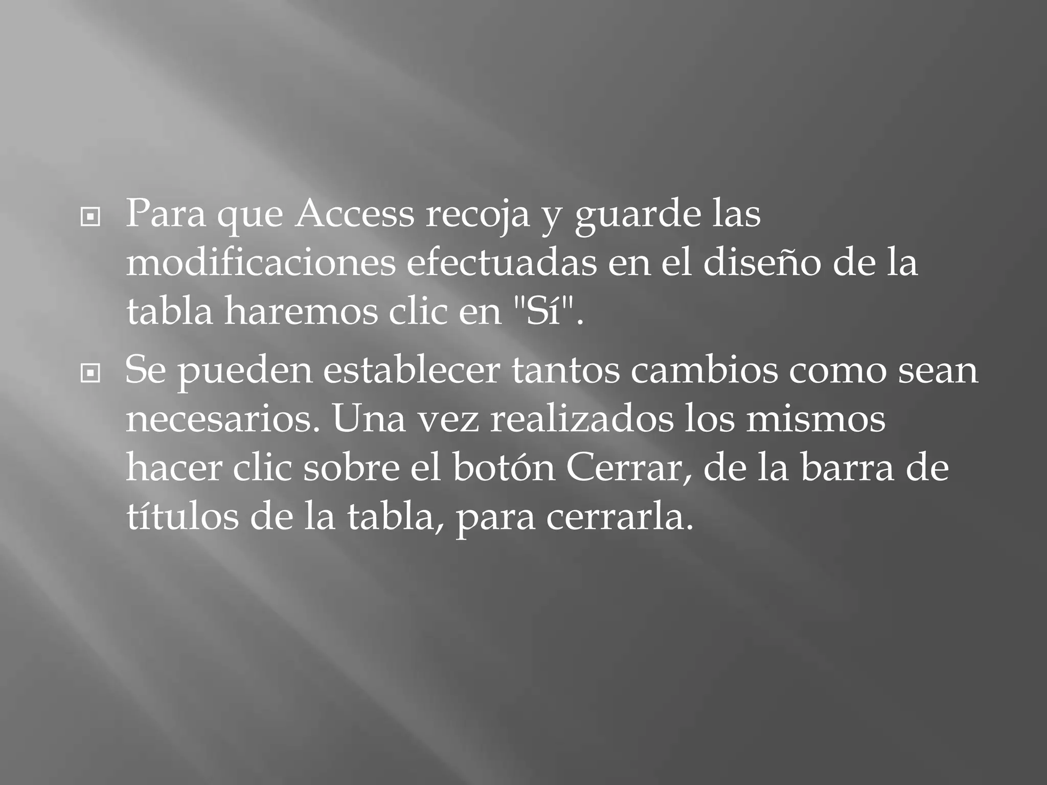 Para que Accessrecoja y guarde las modificaciones efectuadas en el diseño de la tabla haremos clic en "Sí".Se pueden establecer tantos cambios como sean necesarios. Una vez realizados los mismos hacer clic sobre el botón Cerrar, de la barra de títulos de la tabla, para cerrarla.