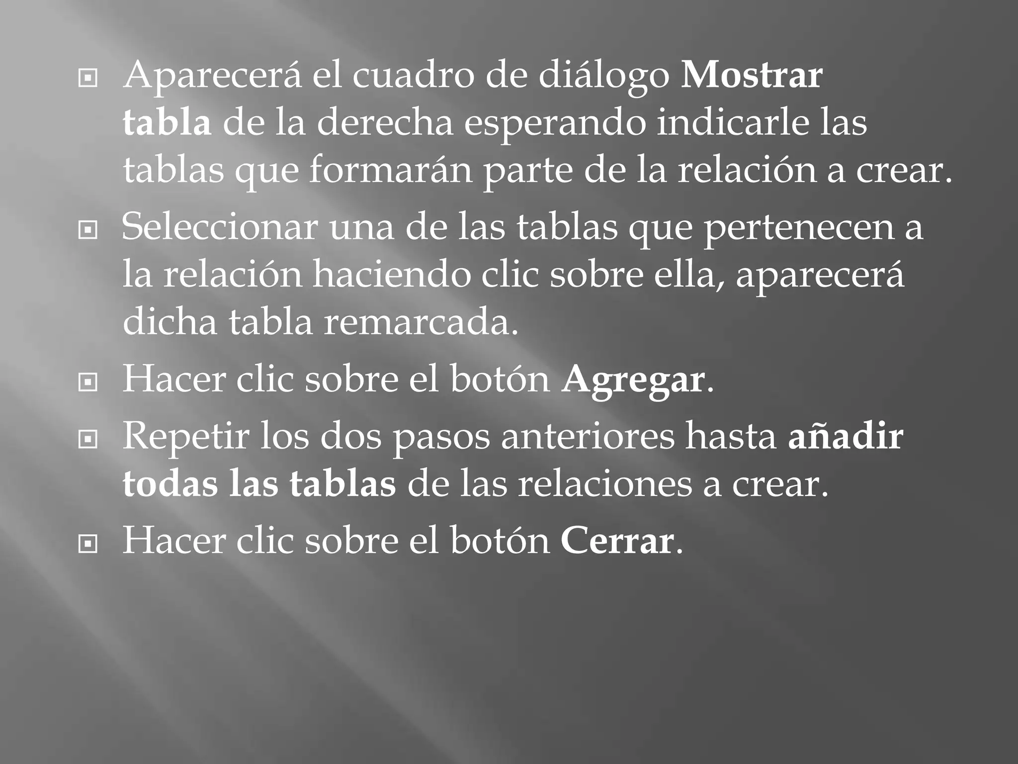 Aparecerá el cuadrode diálogo Mostrar tabla de la derecha esperando indicarle las tablas que formarán parte de la relación a crear.Seleccionar una de las tablas que pertenecen a la relación haciendo clic sobre ella, aparecerá dicha tabla remarcada.Hacer clic sobre el botón Agregar.Repetir los dos pasos anteriores hasta añadir todas las tablas de las relaciones a crear.Hacer clic sobre el botón Cerrar.