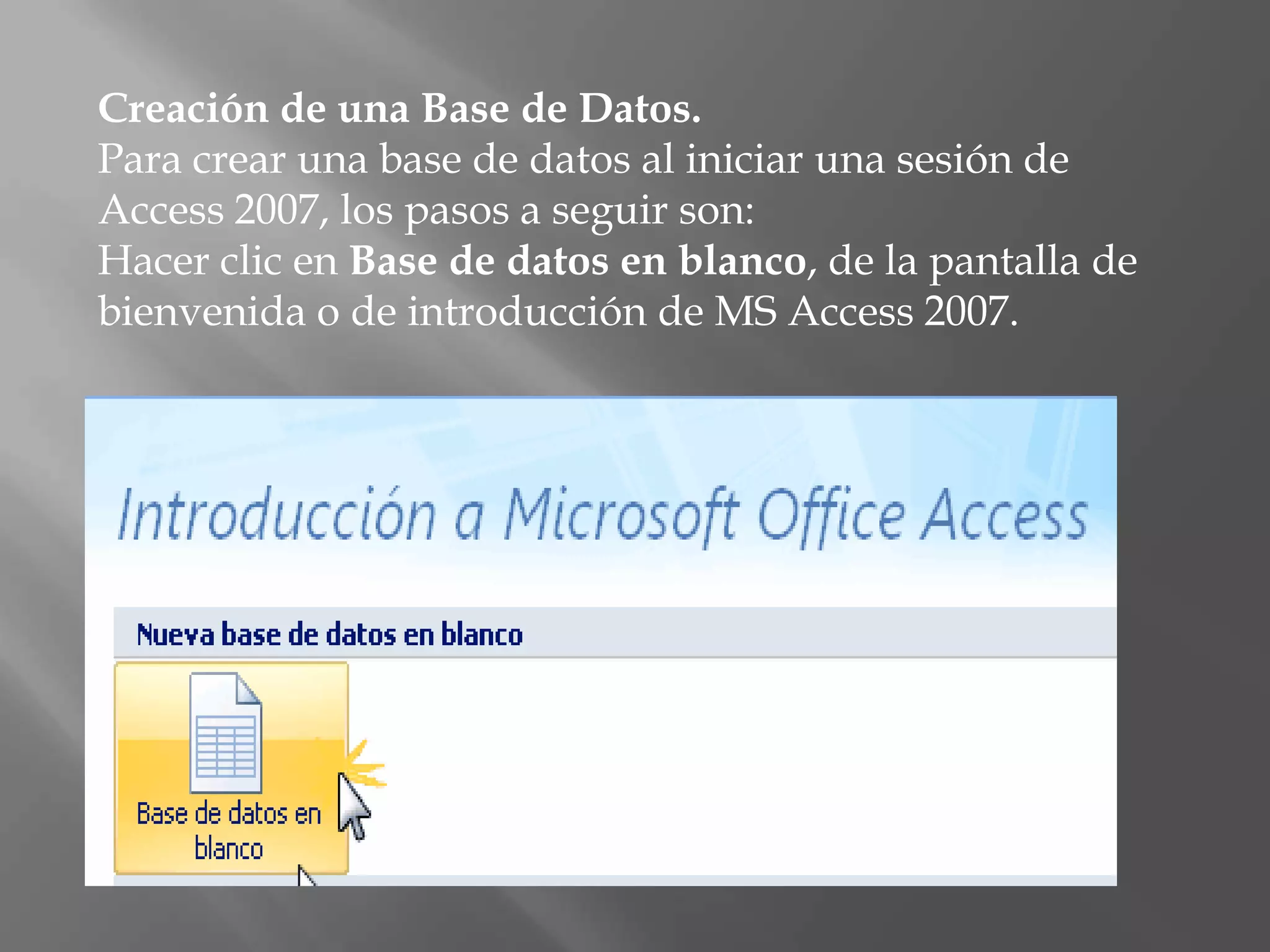 Creación de unaBase de Datos.Para crear una base de datos al iniciar una sesión de Access 2007, los pasos a seguir son:Hacer clic en Base de datos en blanco, de la pantalla de bienvenida o de introducción de MS Access 2007.