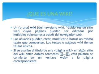 Un wiki es un sitio web cuyas páginas pueden ser editadas por múltiples voluntarios a través del navegador web. Los usuarios pueden crear, modificar o borrar texto compartido y las páginas wiki tienen títulos únicos. Una wiki permite que múltiples autores creen, modifiquen o eliminen contenido de forma colaborativa.