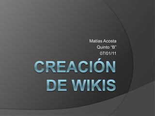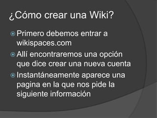 Para crear una wiki, primero se debe crear una cuenta en wikispaces.com e ingresar información como nombre de usuario, contraseña y correo electrónico. Luego se debe dar un nombre a la wiki y seleccionar los permisos y uso. Una vez creada, la página principal de la wiki contiene opciones para páginas, discusión, historia y notificaciones. Dentro de la opción "Administrar Wiki" se pueden administrar el contenido, personas, ajustes y herramientas de la wiki.
