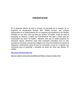 Este documento presenta una propuesta para crear un programa llamado "Dulces Sonrisas" en la comunidad rural de "El Castillo" para brindar atención educativa a niños menores de 3 años. La propuesta incluye un diagnóstico de la comunidad, objetivos, cronograma de actividades, estrategias de trabajo, presupuesto y evaluación del programa. El programa busca beneficiar el desarrollo integral de los niños e involucrar a los padres y la comunidad.