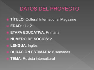 Los alumnos elaborarán una revista digital sobre aspectos culturales de sus países a través del trabajo colaborativo en grupos mixtos. Publicarán la revista en Joomag y realizarán un juego de preguntas sobre la cultura a través de videoconferencia para evaluar lo aprendido. El proyecto pretende fomentar el aprendizaje de idiomas y el uso de herramientas TIC, además de desarrollar sentimientos de pertenencia a Europa y de trabajo colaborativo.