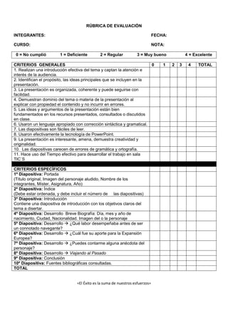 Este documento describe una unidad de implementación sobre los viajes de exploración europea. Los estudiantes trabajarán en grupos para crear una presentación de PowerPoint sobre un personaje protagonista de la expansión europea. La presentación debe contener 10 diapositivas que cubran la biografía del personaje, sus contribuciones a la expansión europea y una anécdota, entre otros requisitos. Los estudiantes serán evaluados en base a criterios como la organización, dominio del tema y uso efectivo de la tecnología.