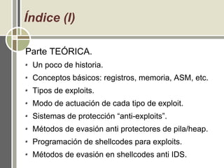 Este documento presenta una guía sobre la creación de shellcodes para exploits en Linux/x86, abordando tanto aspectos teóricos como prácticos de la explotación de vulnerabilidades en aplicaciones. Se discuten conceptos fundamentales, tipos de exploits, métodos de evasión, programación de shellcodes y medidas de protección contra exploits. Además, se ofrecen ejemplos históricos de exploits y se analizan los problemas asociados al desbordamiento de buffers en la memoria.