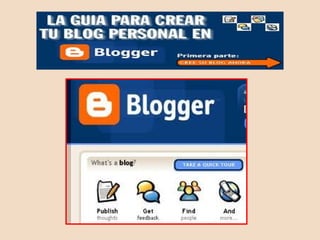 El documento describe los pasos para crear un blog en la plataforma Blogger.com. Estos incluyen ingresar la dirección URL de Blogger y las credenciales de Gmail, aceptar los términos y condiciones, asignar un nombre y dirección URL al blog, seleccionar una plantilla, y comenzar a publicar entradas de blog utilizando un editor similar a Word.