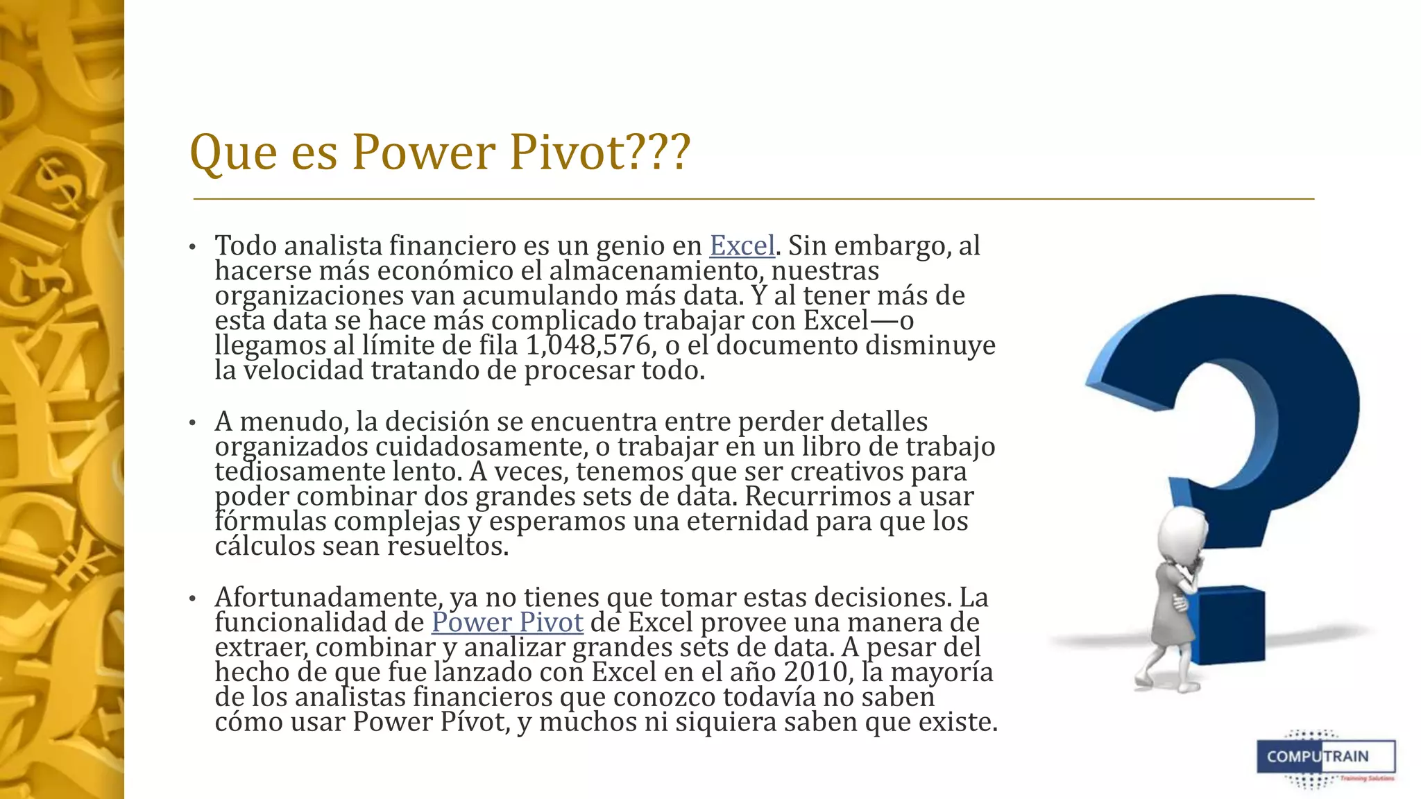 Power Pivot es un complemento de Excel que permite crear sofisticados modelos de datos combinando grandes volúmenes de datos de diferentes orígenes y realizar análisis rápidos. Power Pivot almacena los datos en una base de datos analítica dentro del libro de Excel, lo que permite interactuar con los datos en Excel y Power Pivot de forma similar. Power BI es una suite de herramientas de análisis de negocios que incluye Power BI Desktop para crear informes de forma similar a Excel con Power Pivot, y el servicio Power BI para publicar y compartir