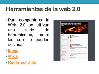 El documento habla sobre las herramientas de la Web 2.0 que se pueden usar para compartir información en línea, incluyendo blogs, wikis y redes sociales. Explica que los blogs son sitios web personales donde los autores publican artículos de manera cronológica sobre cualquier tema e incluyen imágenes, videos y enlaces, y donde los lectores pueden comentar. También describe cómo los blogs educativos llamados "Edublogs" pueden usarse como herramientas de aprendizaje para tareas, investigaciones y publicar recursos educat