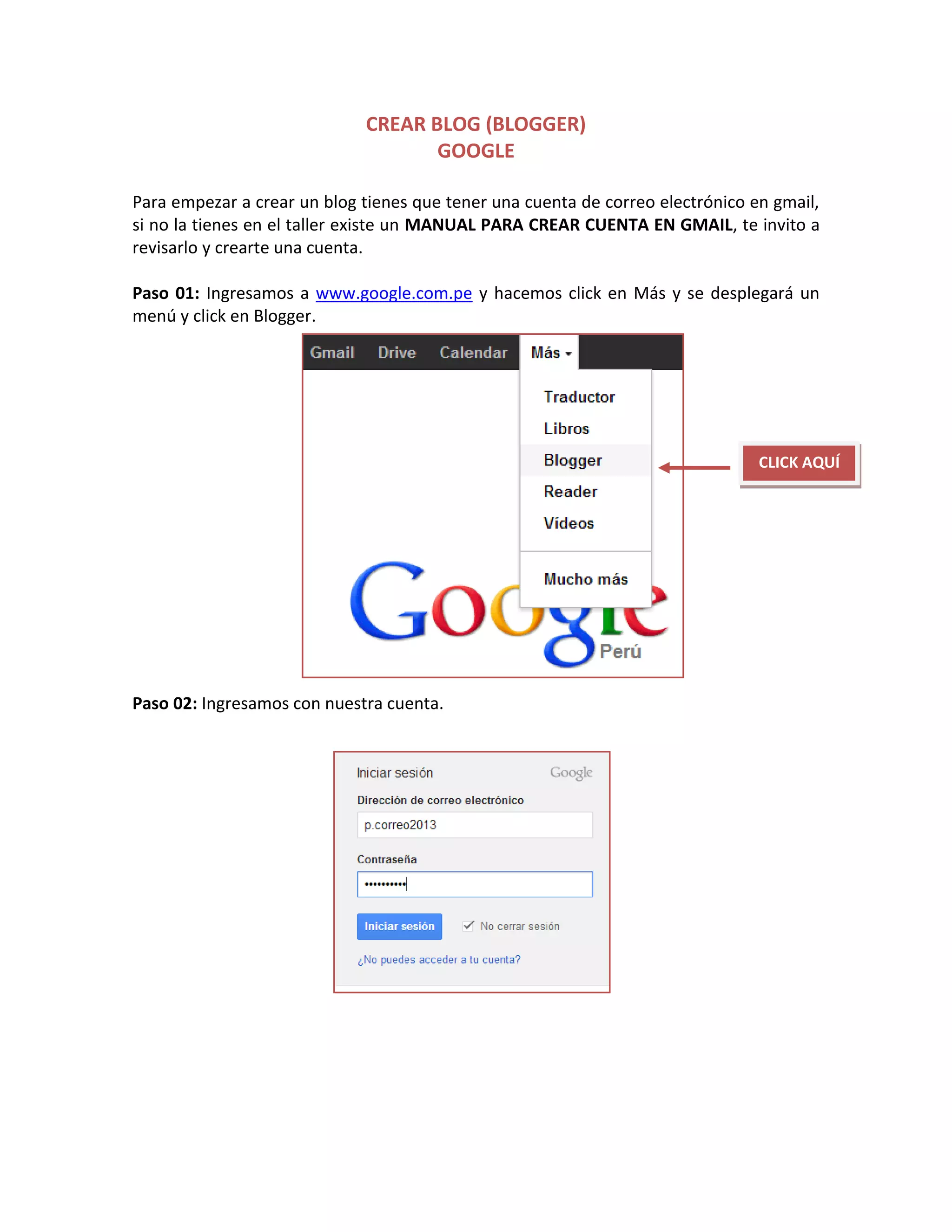 El documento proporciona instrucciones en 9 pasos para crear un blog en Blogger de Google. Primero se requiere una cuenta de Gmail. Luego, se ingresa a Blogger a través de Google, se crea un perfil limitado, y se crea un nuevo blog llenando los campos solicitados como el título y la dirección URL. Finalmente, se agregan entradas al blog insertando imágenes y videos de YouTube.