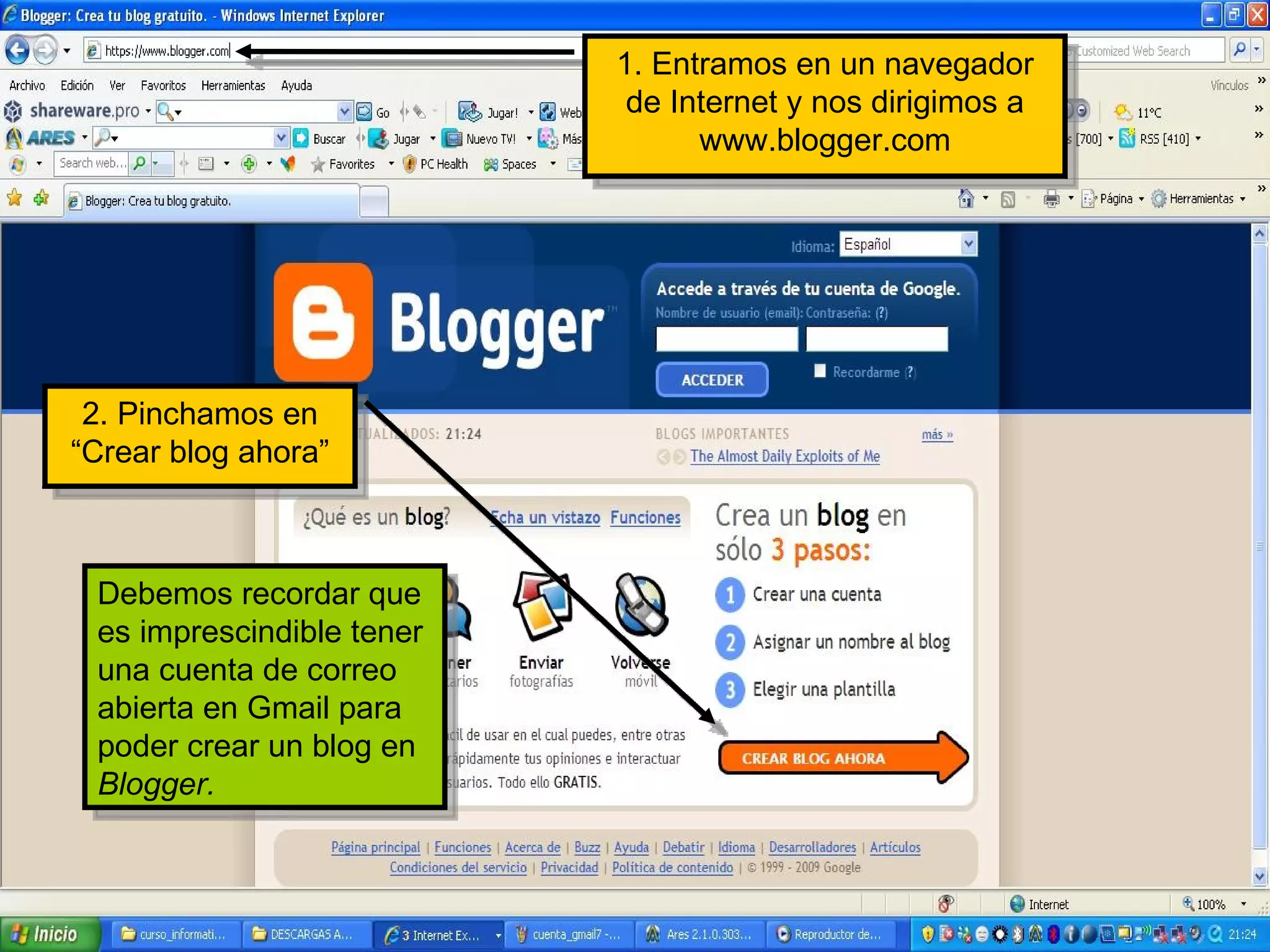 Este documento proporciona instrucciones en 14 pasos para crear un blog en Blogger.com. Primero, el usuario debe iniciar sesión en su cuenta de Gmail y completar los campos solicitados como el nombre, título y dirección del blog. Luego selecciona una plantilla y hace clic en "empezar a publicar" para ver la pantalla de configuración principal. Finalmente, hace clic en "Ver blog" para ver el blog recién creado y comparte la dirección con otros.