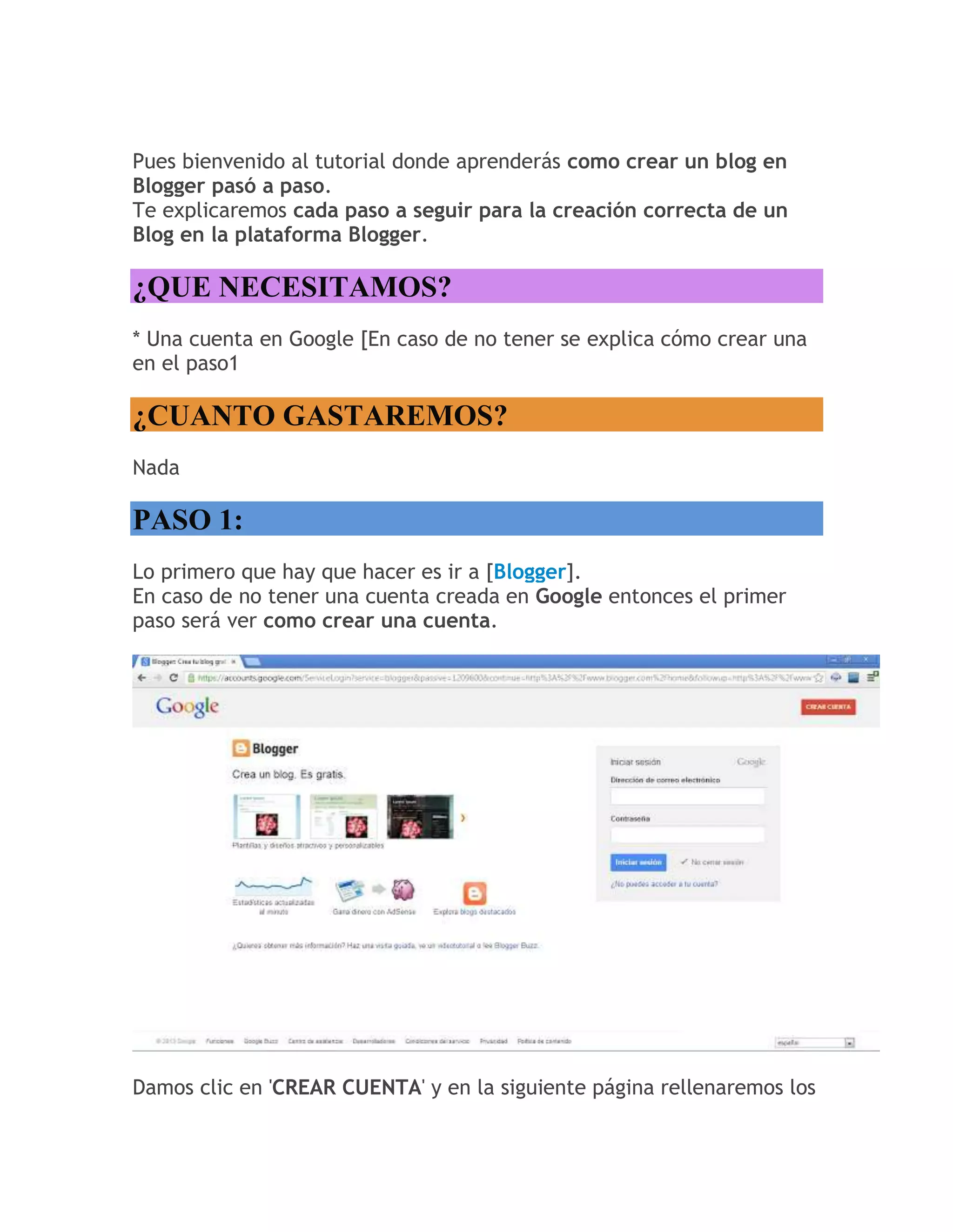 Este documento proporciona un tutorial paso a paso para crear un blog en Blogger. Explica los 8 pasos requeridos: 1) crear una cuenta de Google, 2) navegar a Blogger, 3) elegir un nombre, dirección y plantilla para el blog, 4) crear el blog, 5) agregar contenido mediante la creación de entradas, 6) editar y publicar entradas, 7) ver las entradas publicadas, y 8) personalizar el diseño de la plantilla del blog. El objetivo es enseñar a los lectores a configurar completamente un blog en B