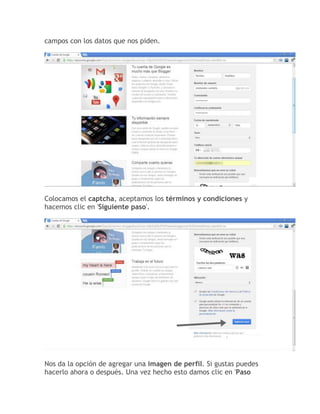 Este documento proporciona un tutorial paso a paso para crear un blog en Blogger. Explica los 8 pasos requeridos: 1) crear una cuenta de Google, 2) navegar a Blogger, 3) elegir un nombre, dirección y plantilla para el blog, 4) crear el blog, 5) agregar contenido mediante la creación de entradas, 6) editar y publicar entradas, 7) ver las entradas publicadas, y 8) personalizar el diseño de la plantilla del blog. El objetivo es enseñar a los lectores a configurar completamente un blog en B