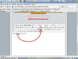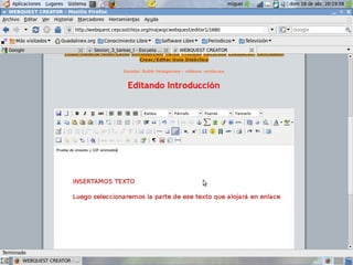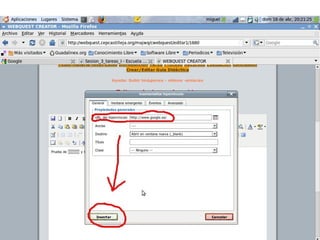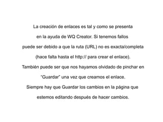 Este documento ofrece instrucciones para crear enlaces e insertar imágenes en WebQuest Creator. Explica que para crear enlaces debes copiar la URL completa del sitio web y pegarla en la herramienta de creación de enlaces. También indica que para insertar imágenes debes copiar la URL de la imagen en lugar de guardar la imagen y pegar la URL donde quieras que aparezca la imagen. Recuerda guardar los cambios después de insertar contenido.