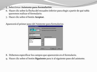El documento proporciona instrucciones en 11 pasos para crear un formulario en una base de datos, que incluyen abrir la base de datos, seleccionar la opción de crear formulario, elegir la tabla de origen, especificar los campos, seleccionar el estilo y finalizar el proceso.
