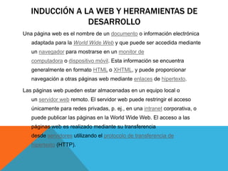 Este documento proporciona una introducción a las páginas web y las herramientas de desarrollo. Explica que una página web es un documento electrónico accesible a través de un navegador y que generalmente se encuentra en formato HTML o XHTML. También describe cómo funcionan los servidores web, las direcciones URL, e introduce conceptos básicos como imágenes, enlaces y el lenguaje HTML para crear páginas web.