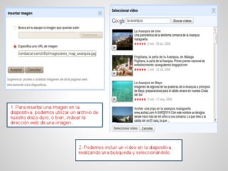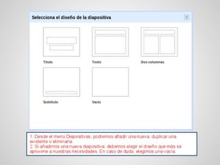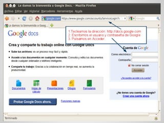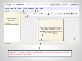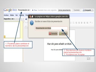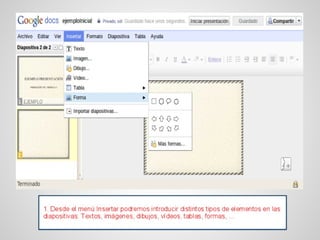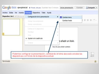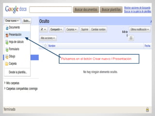 Este documento proporciona una introducción a las funciones de creación de presentaciones en Google Docs. Explica cómo crear nuevos documentos y organizarlos en colecciones, y también cómo publicar y compartir documentos con otros usuarios.