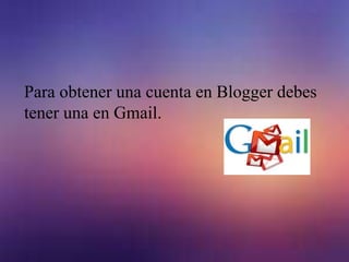 Para crear un blog en Blogger, primero se requiere una cuenta de Gmail. Luego, se ingresa a la página de Blogger a través de un navegador y se crea un nuevo blog eligiendo un título, dirección y plantilla. Finalmente, se publican nuevas entradas en el blog para que otros usuarios puedan ver el contenido.