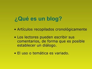 Este documento explica cómo crear y configurar un blog usando el servicio Blogger de Google. Detalla los pasos para registrarse en Blogger, asignar un nombre y dirección URL al blog, elegir una plantilla, escribir entradas con títulos, texto, etiquetas e imágenes, y configurar opciones como comentarios, diseño, notificaciones y estadísticas. El objetivo final es tener un blog listo para publicar contenidos útiles.