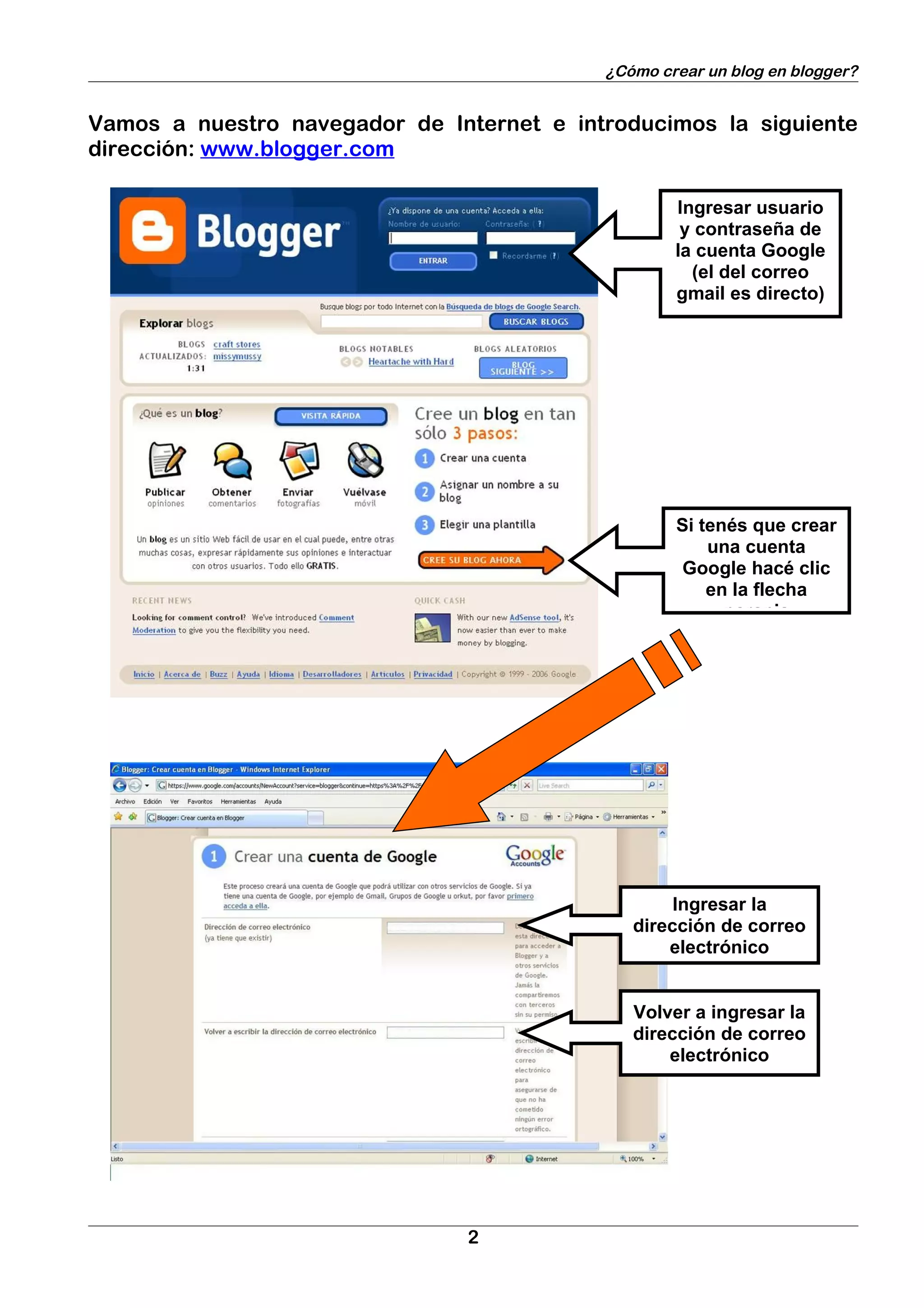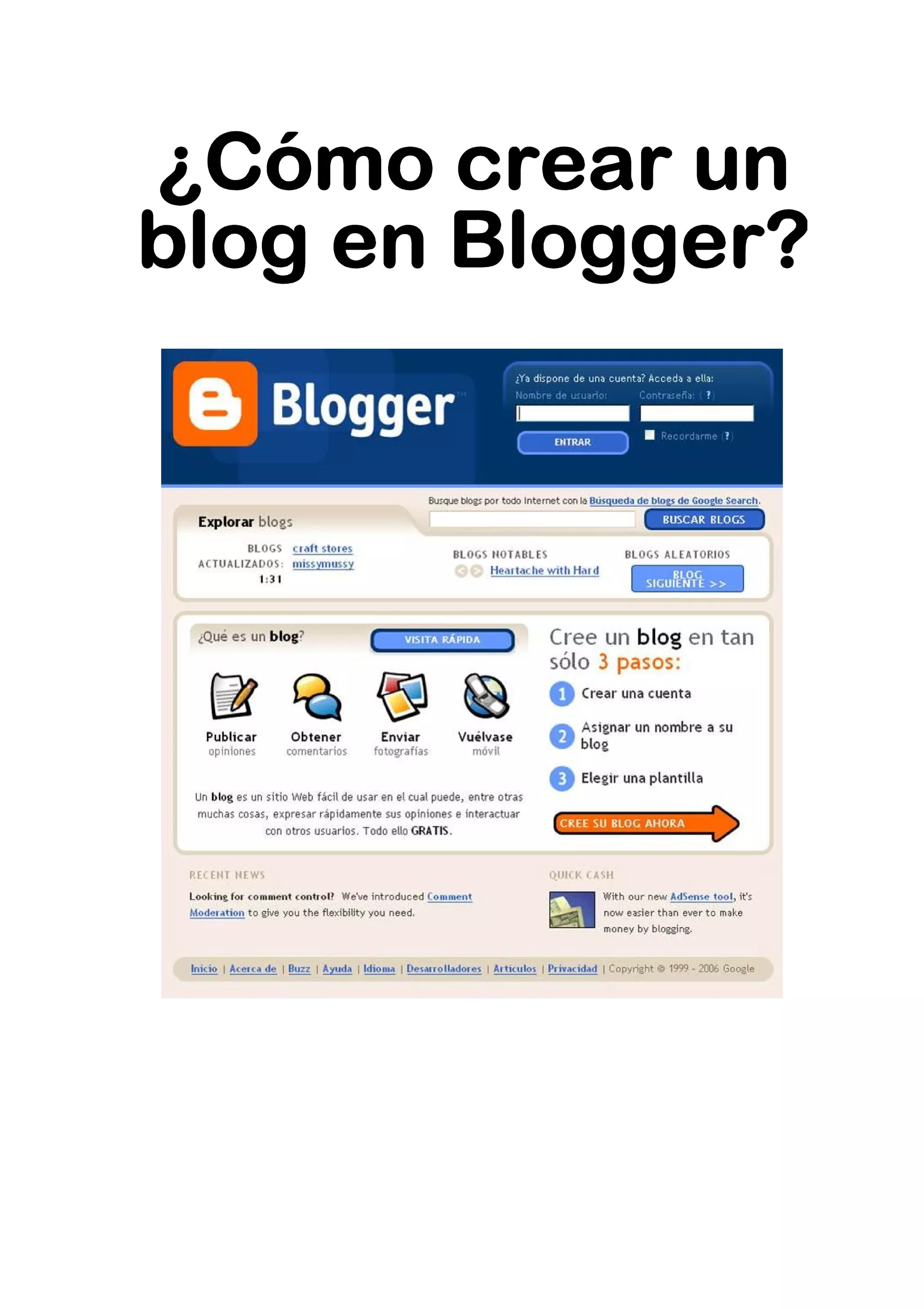 El documento explica los pasos para crear un blog en Blogger. Primero, se debe ingresar a www.blogger.com e iniciar sesión con una cuenta de Google o crear una nueva. Luego, se debe dar un nombre y URL al blog, elegir una plantilla, y escribir la primera entrada o post, incluyendo título, contenido, etiquetas e imágenes. Finalmente, el blog está listo para publicar contenido.