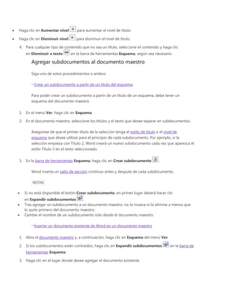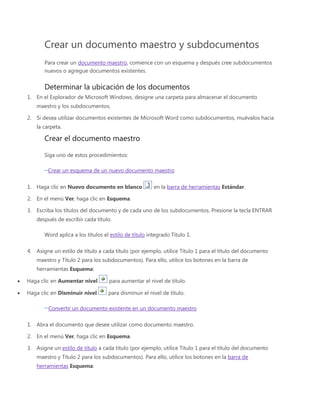 Este documento describe cómo crear un documento maestro en Microsoft Word con subdocumentos. Explica cómo determinar la ubicación de los archivos, crear un esquema para el documento maestro con títulos de subdocumentos, y agregar subdocumentos existentes o nuevos insertándolos desde el esquema o archivo. También cubre cómo guardar el documento maestro y sus subdocumentos.