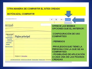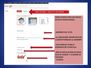 Google Sites es una herramienta para crear sitios web colaborativos. Ofrece instrucciones para crear una cuenta de Google y una nueva página web en Google Sites. Explica cómo editar páginas, agregar nuevas páginas, y configurar opciones como las barras laterales y de navegación. También proporciona un enlace a un tutorial más detallado sobre el uso de Google Sites.