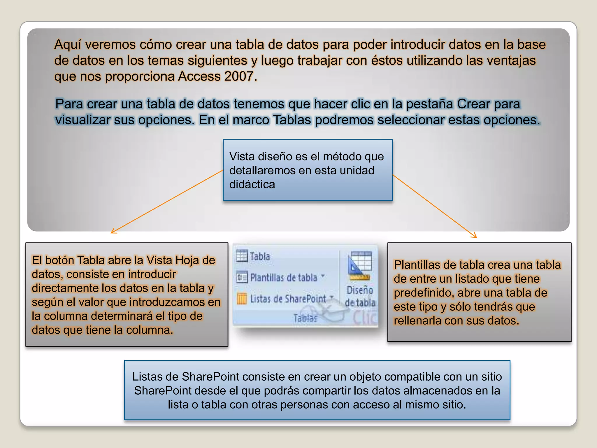 El documento explica cómo crear tablas de datos en Access 2007. Se pueden crear tablas mediante la vista de diseño, que permite definir la estructura de la tabla incluyendo las columnas y propiedades. También se pueden crear tablas rápidamente usando plantillas predefinidas o compartiendo datos con listas de SharePoint.