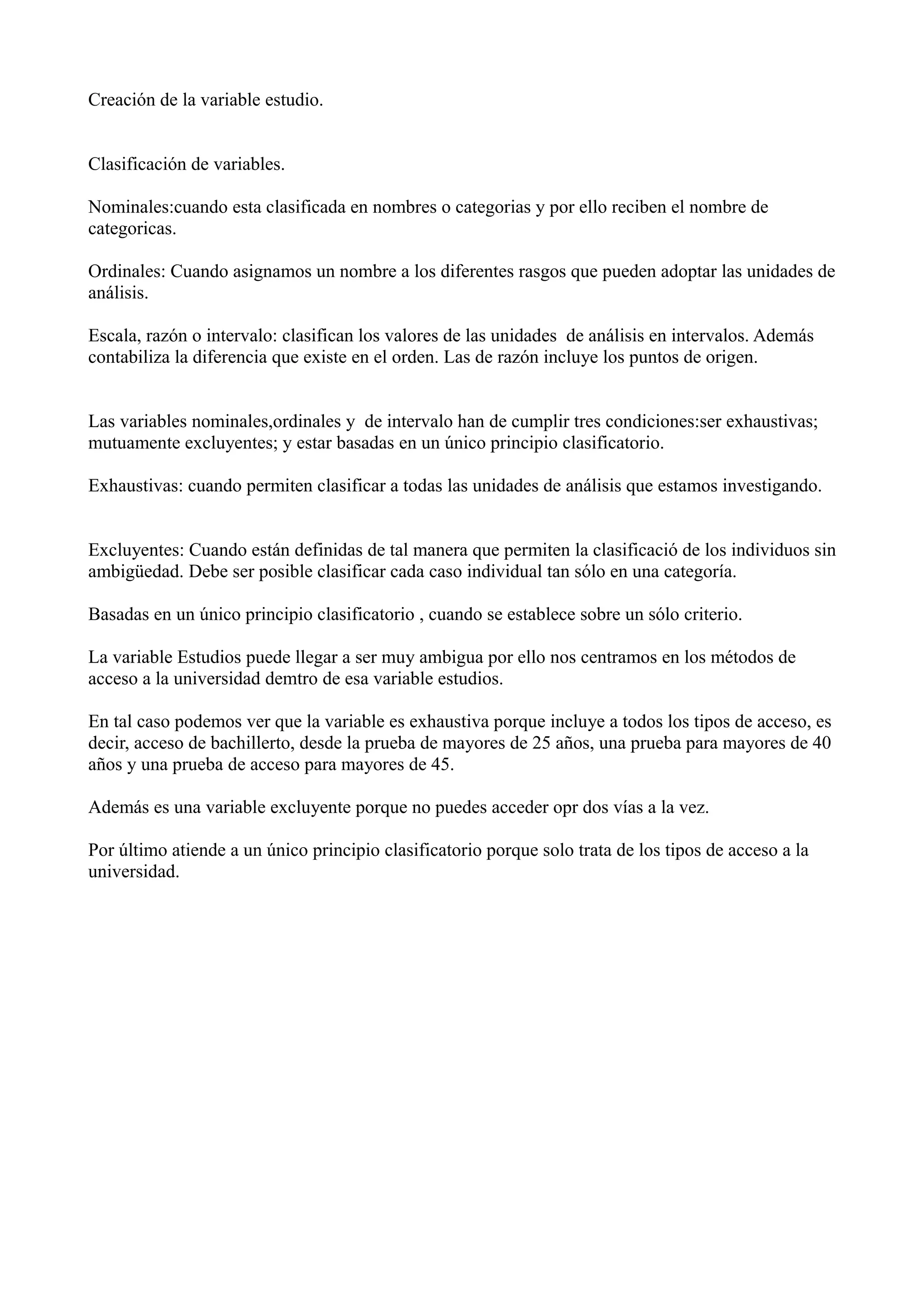 Este documento describe diferentes tipos de variables para estudios, incluyendo variables nominales, ordinales y de escala/intervalo. Explica que las variables nominales, ordinales y de intervalo deben ser exhaustivas, mutuamente excluyentes y basadas en un único principio clasificatorio. Luego usa el ejemplo de la variable "Estudios" y cómo podría clasificarse según el método de acceso a la universidad de manera exhaustiva, excluyente y basada en un único criterio.