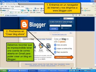 Este documento proporciona instrucciones en 14 pasos para crear un blog en Blogger.com. Primero, el usuario debe iniciar sesión en su cuenta de Gmail y completar los campos solicitados como el nombre, título y dirección del blog. Luego selecciona una plantilla y hace clic en "empezar a publicar" para ver la pantalla de configuración del blog recién creado. Finalmente, el usuario puede ver su nuevo blog publicado en línea ingresando a la dirección asignada con el formato www.nombre.blogspot.com.