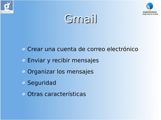 Gmail es el servicio de correo electrónico gratuito de Google. El documento explica los pasos para crear una cuenta de Gmail, que incluyen ingresar a gmail.com, hacer clic en el botón para crear una cuenta, completar el formulario de registro e ingresar la información de nombre de usuario y contraseña, y aceptar los términos para finalizar el proceso de creación de cuenta.