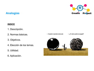 Este documento describe la técnica de analogías para generar ideas. Explica que las analogías establecen relaciones entre cosas distintas para encontrar soluciones a problemas de forma creativa. Detalla los pasos para aplicar analogías, incluyendo definir el enfoque, seleccionar temas, crear analogías y generar ideas. También cubre los objetivos de esta técnica como aclarar ideas, ahorrar tiempo y facilitar la generación de estrategias de manera efectiva.