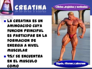La creatinina es un aminoácido producido en el músculo que se elimina por el riñón. Los niveles de creatinina en sangre indican la función renal, ya que valores altos sugieren disminución en la excreción renal. El índice de filtración glomerular mide la tasa de filtración renal y valores normales están entre 95-160 ml/minuto.
