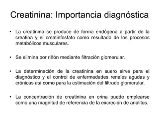 Este documento describe métodos para determinar la creatinina y la tasa de filtración glomerular. Explica que la creatinina se produce de forma endógena y se elimina por riñón, y que su determinación sirve para diagnosticar enfermedades renales. Describe métodos colorimétricos, enzimáticos y de referencia para medir creatinina, así como los valores de referencia propuestos luego de la estandarización. También explica cómo medir la tasa de filtración glomerular usando la depuración de marcadores como la inulina