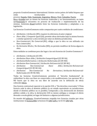 Creative Commons (CC) es una organización sin fines de lucro que permite compartir y usar la creatividad y el conocimiento a través de licencias de derechos de autor gratuitas. Las licencias CC ofrecen al creador de una obra la opción de cambiar los términos de los derechos de autor de "todos los derechos reservados" a "algunos derechos reservados". Existen seis licencias CC principales que combinan cuatro cláusulas relacionadas con la atribución, el uso comercial, las obras derivadas y el compartir por igual.